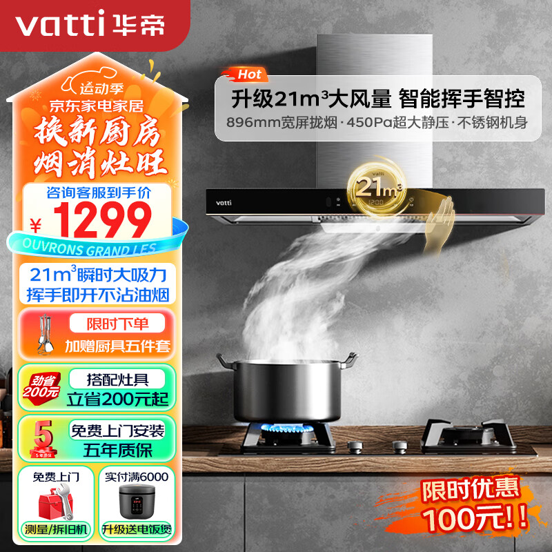 华帝(VATTI)官方抽油烟机 欧式顶吸家用吸油烟机小尺寸 21立方米大吸力 挥手即开 脱排油烟机i11176价格:1299.00元!