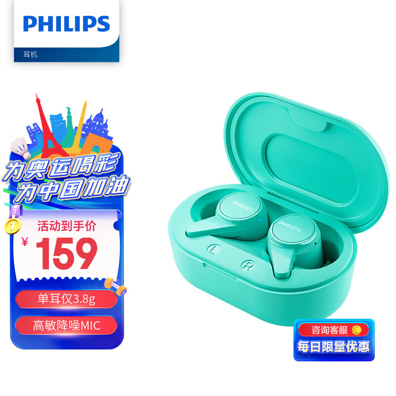 飞利浦(PHILIPS)真无线蓝牙耳机无线运动耳机游戏耳机回音降噪蓝牙5.2智能配对苹果华为手机TAT1207绿价格:159.00元!