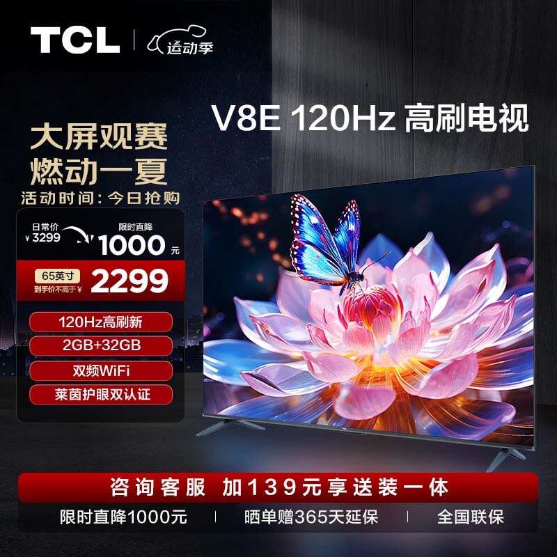 TCL电视 65V8E 65英寸 120Hz MEMC防抖 2+32GB 4K超高清 客厅液晶智能平板游戏电视机价格:2299.00元!