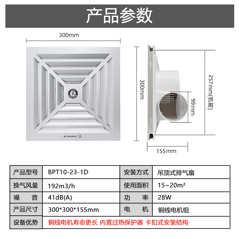 金羚(JINLING)排气扇卫生间换气扇厨房排风扇(集成吊顶专用)BPT10-23-1D价格:159.00元!