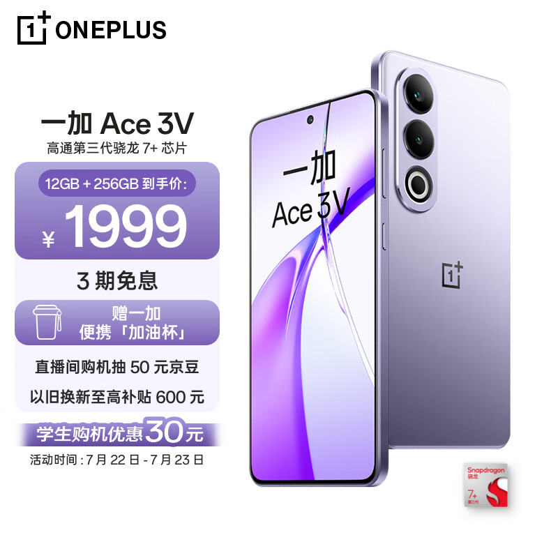 一加 Ace 3V 12GB+256GB 幻紫银 高通第三代骁龙 7+ 芯片 超长续航 OPPO AI 5G直屏游戏拍照智能手机价格:1999.00元!