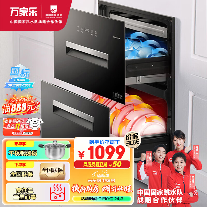 万家乐消毒柜嵌入式 家用100升大容量二高温消毒 钢化玻璃面板 双门消毒碗柜RQD100-DQ054价格:1099.00元!