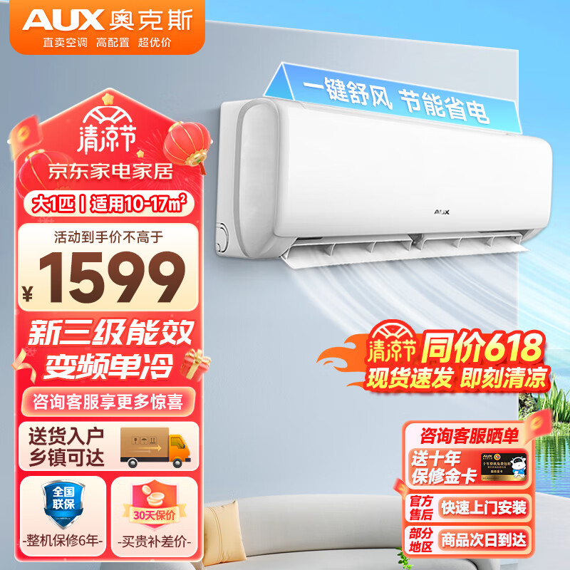 奥克斯单冷空调 大1匹 新3级能效变频 挂机卧室 一键舒风 30秒速冷 家用租房出租壁挂式挂机空调价格:1498.00元!