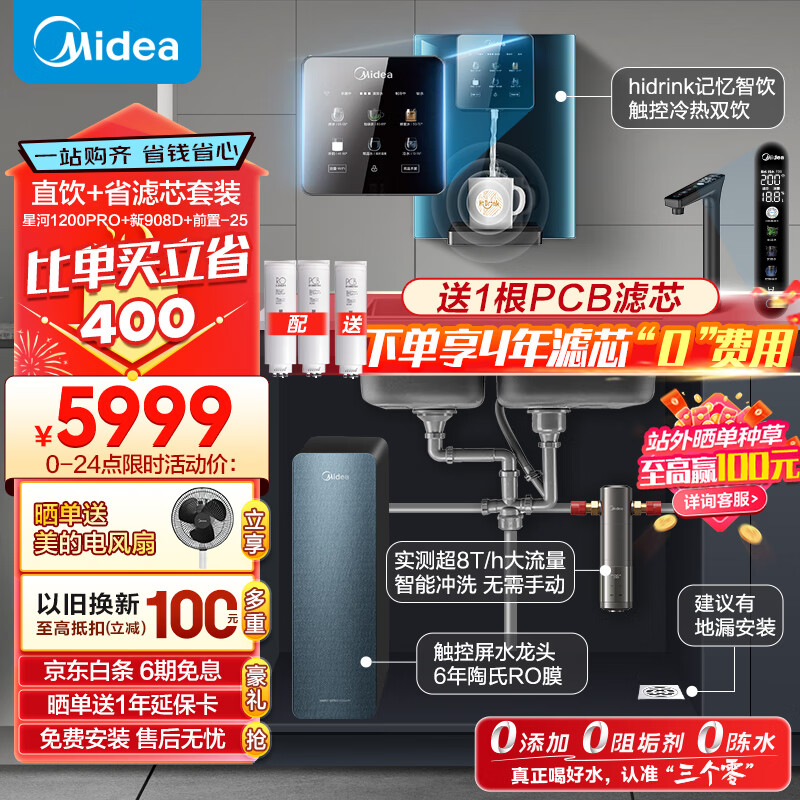 美的(Midea)省芯直饮冷热净水器套装【星河1200pro+管线机908D+前置-25pro】hidrink 壁挂式加热一体净饮机价格:5999.00元!