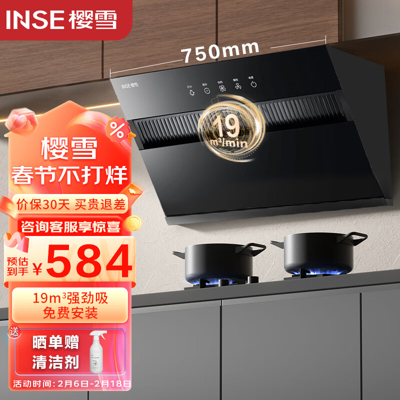 樱雪(INSE)一级节能侧吸家用抽油烟机 19m3/min小尺寸大吸力 易清洁厨房脱排油烟机C1925(B)W价格:584.00元!