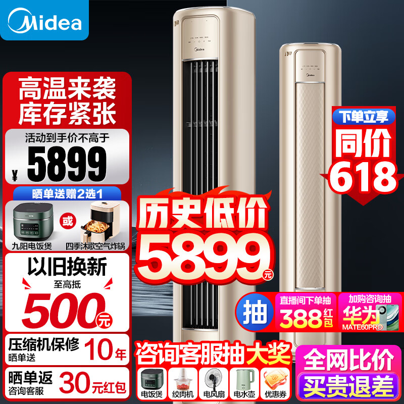 美的(Midea)空调大2匹风尊 新一级能效 变频冷暖 客厅立式空调智能除菌柜机3D立体风防直吹大风口金色圆形柜价格:5899.00元!