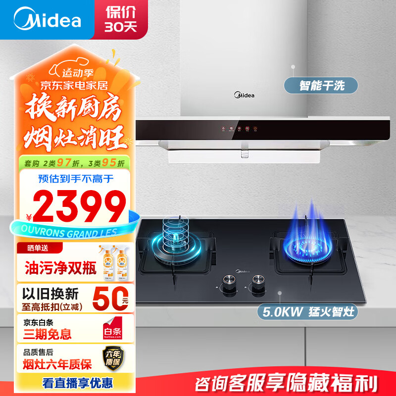 美的(Midea)顶吸欧式抽油烟机 22大吸力 家用厨房油烟机排烟罩 自动清洗 烟灶套装 T36+Q36S(天然气)价格:2399.00元!