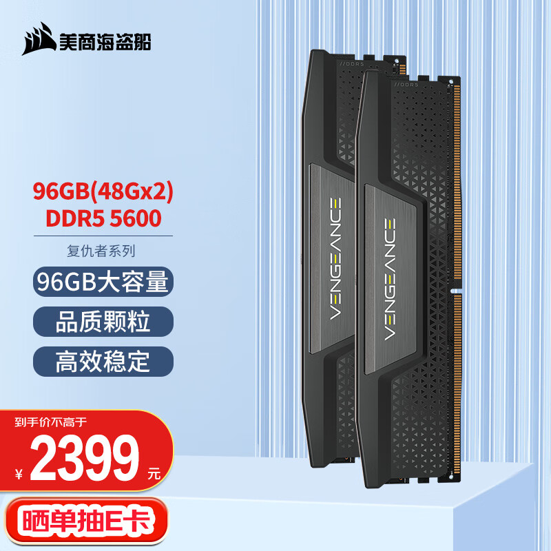 美商海盗船 (USCORSAIR) 96GB(48Gx2)套装 DDR5 5600 台式机内存条 复仇者系列 游戏条 黑色 C40价格:2399.00元!