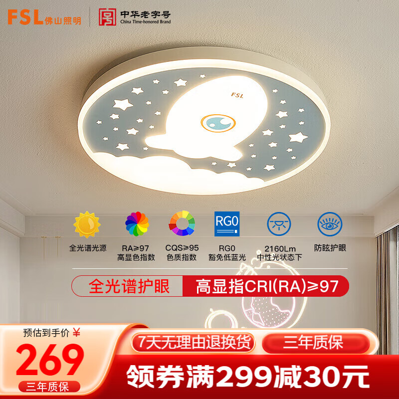 FSL佛山照明吸顶灯LED卧室灯低蓝光护眼高显97儿童房调色灯具飞船36W价格:299.00元!
