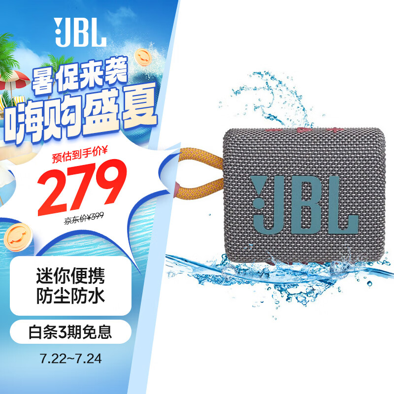 JBL GO3 音乐金砖三代 便携蓝牙音箱 低音炮 户外音箱 迷你音响 极速充电长续航 防水防尘设计 灰色价格:279.00元!