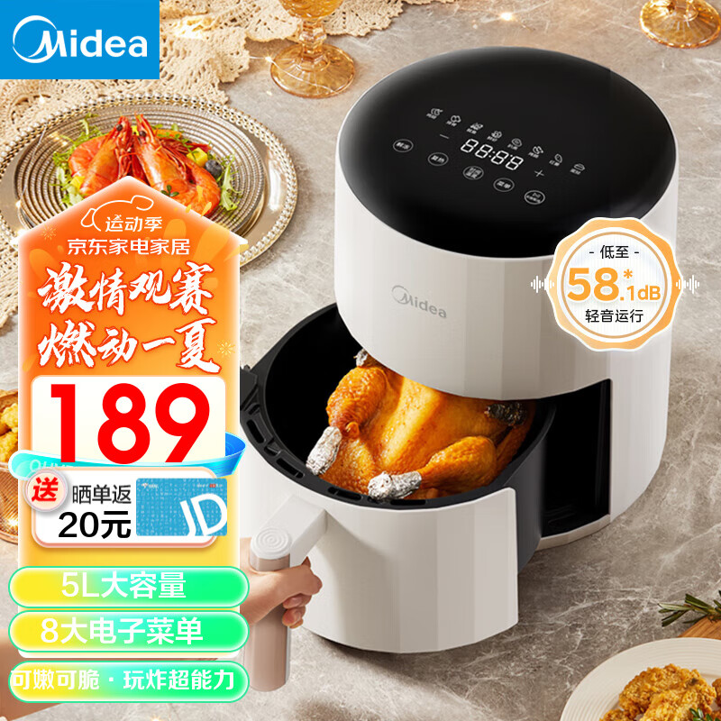 美的(Midea) 空气炸锅低油炸家用空气炸烤箱不粘全自动大容量大功率新款智能多功能电气炸锅薯条蛋挞炸鸡机 5升大容量 KZC5060【电子款】 5L价格:299.00元!