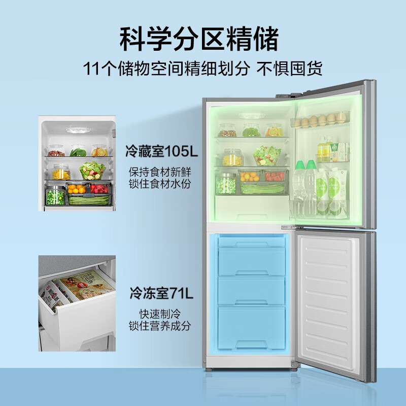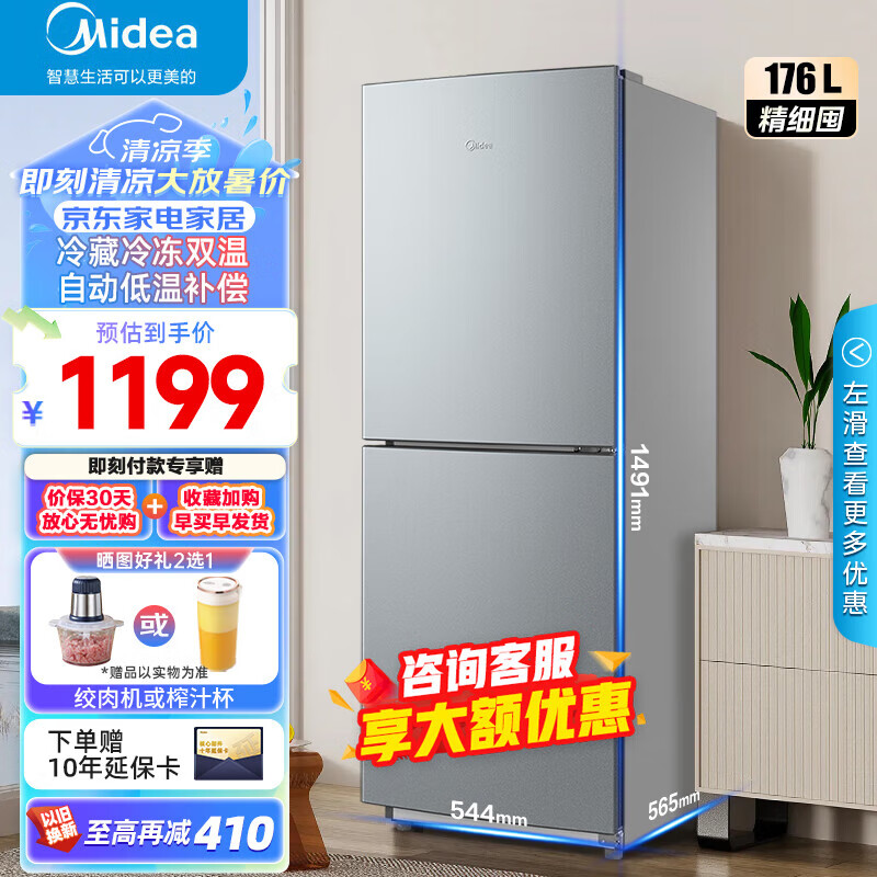 美的(Midea)冰箱176升双开门小型冰箱 家用宿舍租房节能两门超薄电冰箱 冷藏冷冻双温 自动低温补偿 BCD-176CM价格:1199.00元!