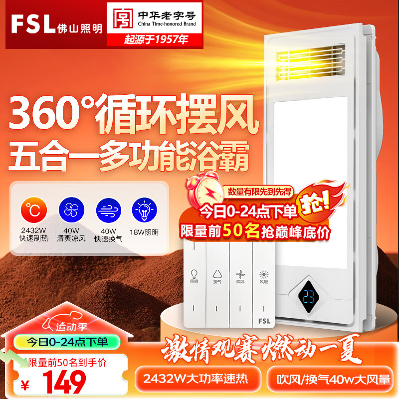 FSL佛山照明浴霸风暖浴霸暖风机浴室取暖器集成吊顶浴霸五合一浴霸价格:299.00元!