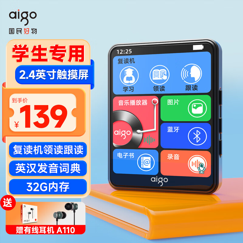 爱国者aigo 325-32G mp3/mp4播放器无损音乐随身听2.4英寸蓝牙外放发声词典电子书 学生听英语听力复读机价格:139.00元!