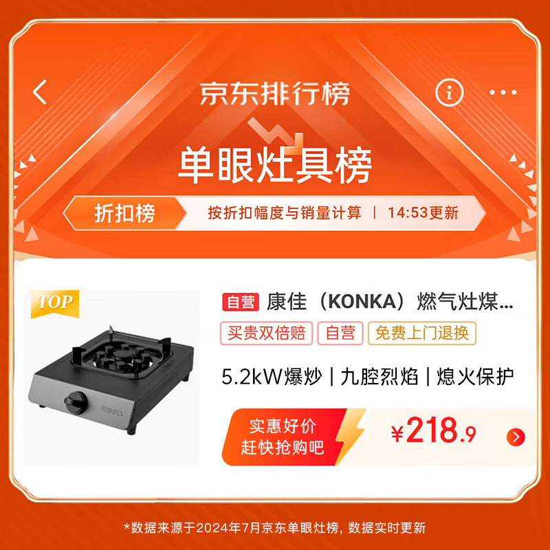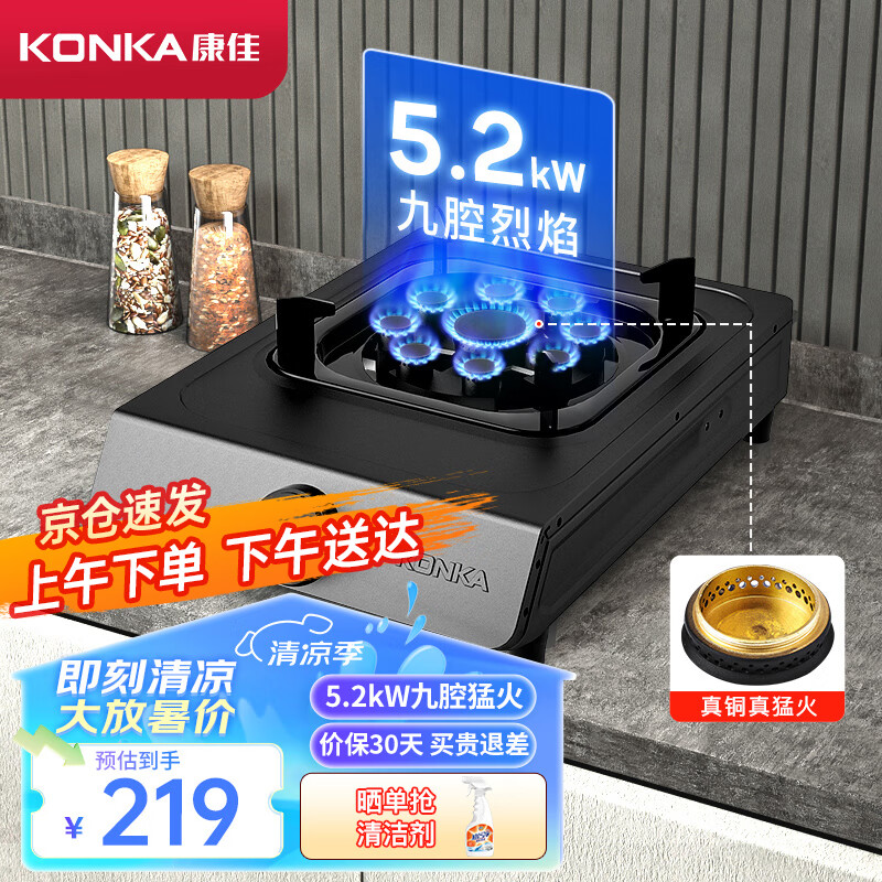 康佳(KONKA)燃气灶煤气灶台式单灶家用 5.2kW天然气九腔猛火灶具 黑色耐脏易清洁面板JZT-KW07T(天然气)价格:219.00元!
