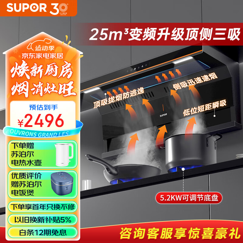 苏泊尔(SUPOR)抽油烟机 顶侧双吸油烟机灶具套装 25立方变频 5.2KW可调节烟灶 家用油烟机燃气灶 DL35+DB28液价格:2496.00元!