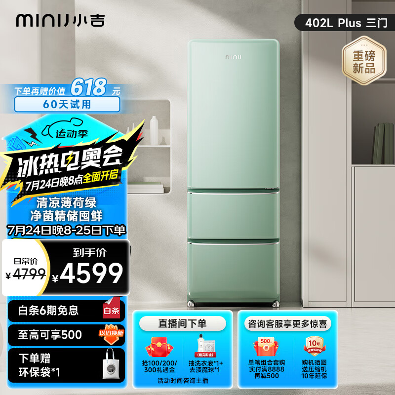 小吉(MINIJ)402LPlus客厅冰箱双变频风冷无霜一级能效超薄嵌入式三门冰箱丨干湿分储变温低噪BCD-JY402G2价格:4799.00元!