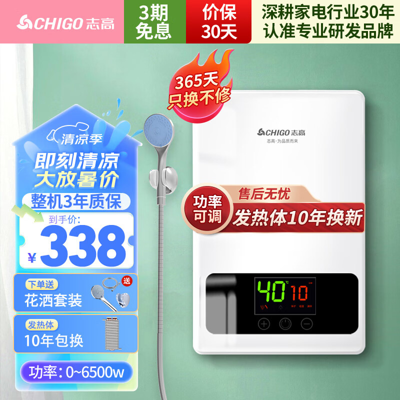 志高(CHIGO)即热式电热水器超薄小厨宝6500W变频恒温智能省电出租房家用洗澡免储水 KBR-Y6S价格:338.00元!