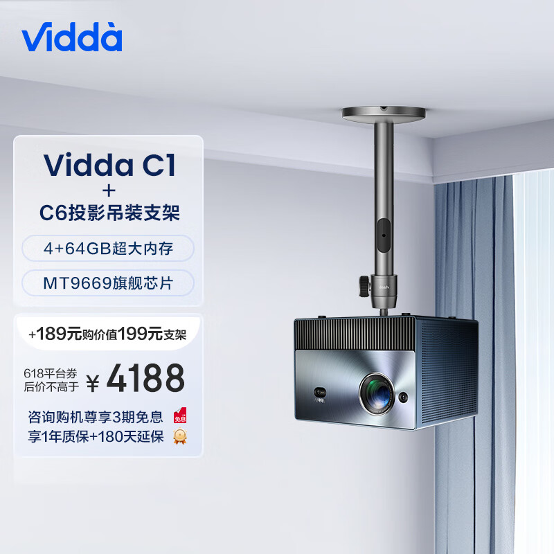 Vidda C1 海信三色激光投影仪 4K超高清投影仪家用投影机 便携电视卧室办公室游戏智能(含投影仪吊架)价格:4188.00元!