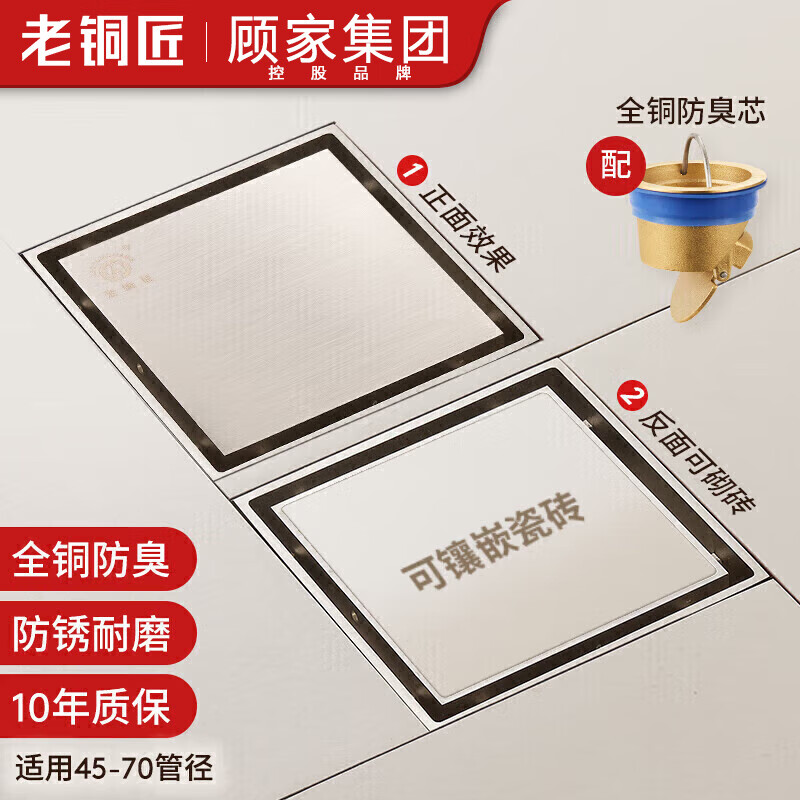 老铜匠顾家集团全铜防臭地漏 方形可嵌砖隐形地漏淋浴房阳台 隐形地漏价格:106.38元!