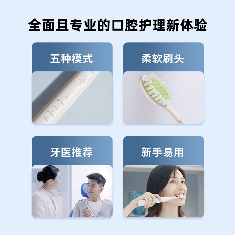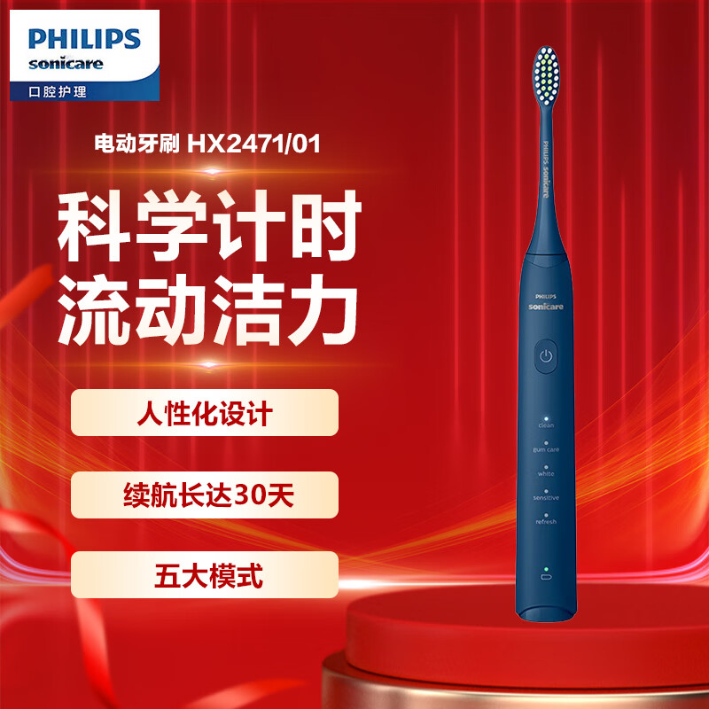 飞利浦(PHILIPS)电动牙刷成人情侣款 送女友/男友软毛柔和亮白刷头5效宝藏刷深藏BLUE HX2471/01价格:229.00元!