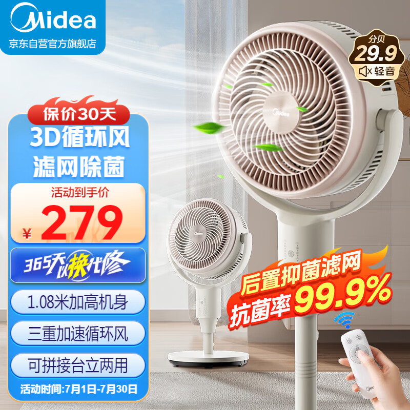 美的(Midea)电风扇 空气循环扇家用立式遥控落地扇涡轮换气扇循环对流3D摇头电扇轻音低噪大风力节能风扇 FGA24TLK【抑菌滤网 净享柔风】价格:399.00元!