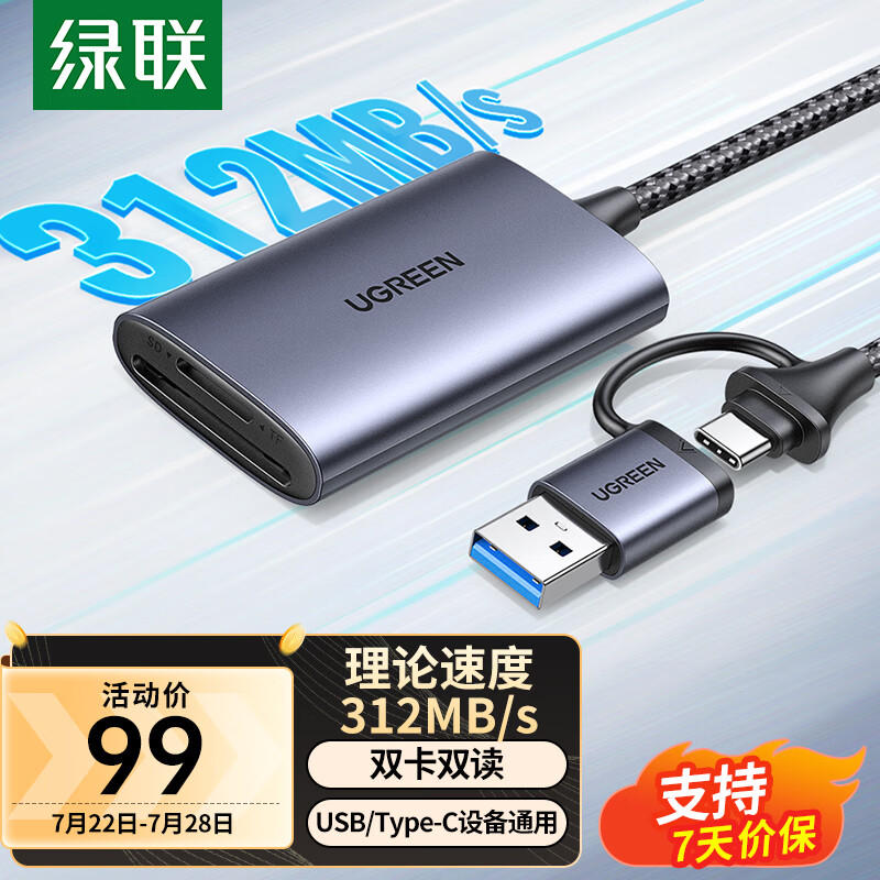绿联(UGREEN)USB/Type-C高速4.0读卡器 SD/TF双卡同读 适用电脑苹果15/iPad/单反/手机 支持UHS-I/II卡 0.5m线价格:99.00元!