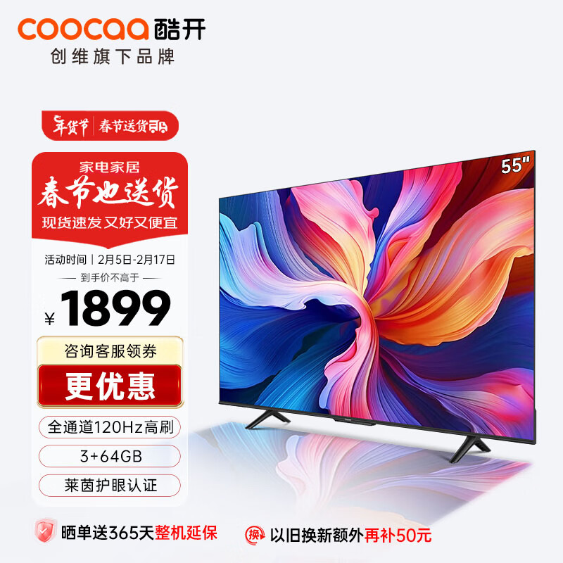 酷开创维K3 Pro 55英寸电视 120Hz高刷 3+64G 4K护眼 声控投屏液晶平板游戏电视机以旧换新55P3D Max价格:2299.00元!