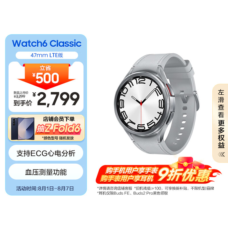 三星[七夕送礼]Galaxy Watch6 Classic eSIM独立通话/智能手表/运动电话手表 47mm 星系银 男女表价格:2799.00元!