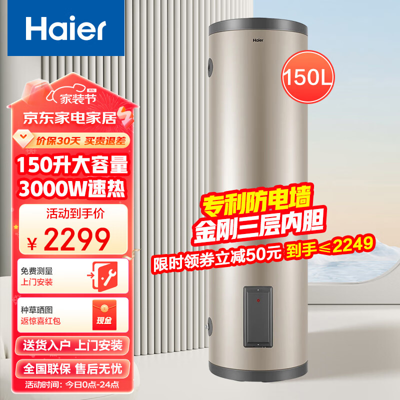 海尔(Haier)立式电热水器 150升大容量3000W速热 商用中央落地式储水竖式全屋工厂理发店宿舍用水ES150F-LC价格:2299.00元!