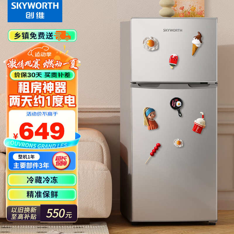 创维(SKYWORTH)118升冰箱小型 双门两门电冰箱 家用宿舍租户 迷你型冷藏冷冻 节能降噪 BCD-118炫银价格:649.00元!