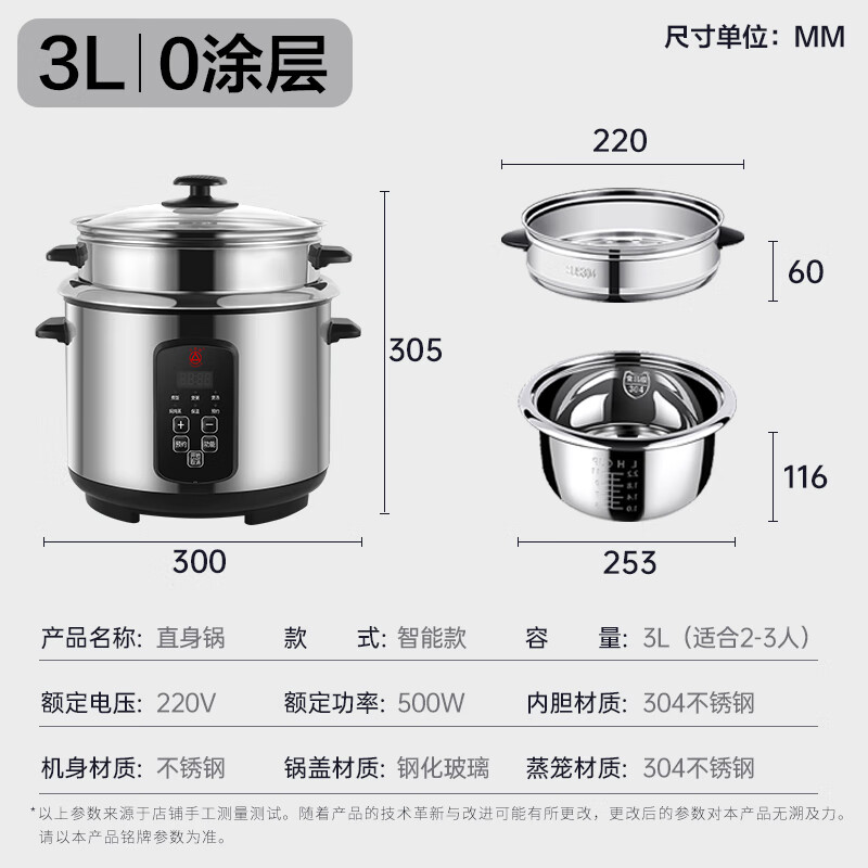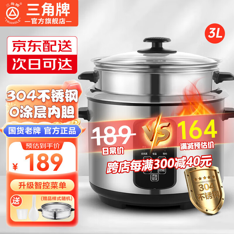 三角牌(Triangle) 电饭煲老式电饭锅不锈钢家用煮饭锅米饭锅带蒸笼家庭用 3升丨304内胆【升级智能款】价格:189.00元!