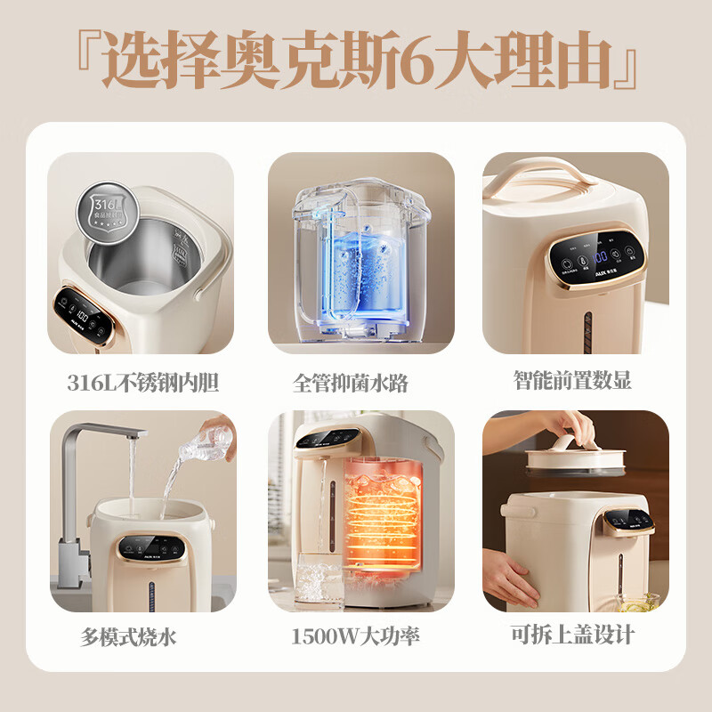 奥克斯(AUX)电热水瓶 恒温水壶 电水壶 电热水壶 5升大容量防烫除氯多段保温 烧水壶【316L不锈钢内胆】8585Y价格:269.00元!