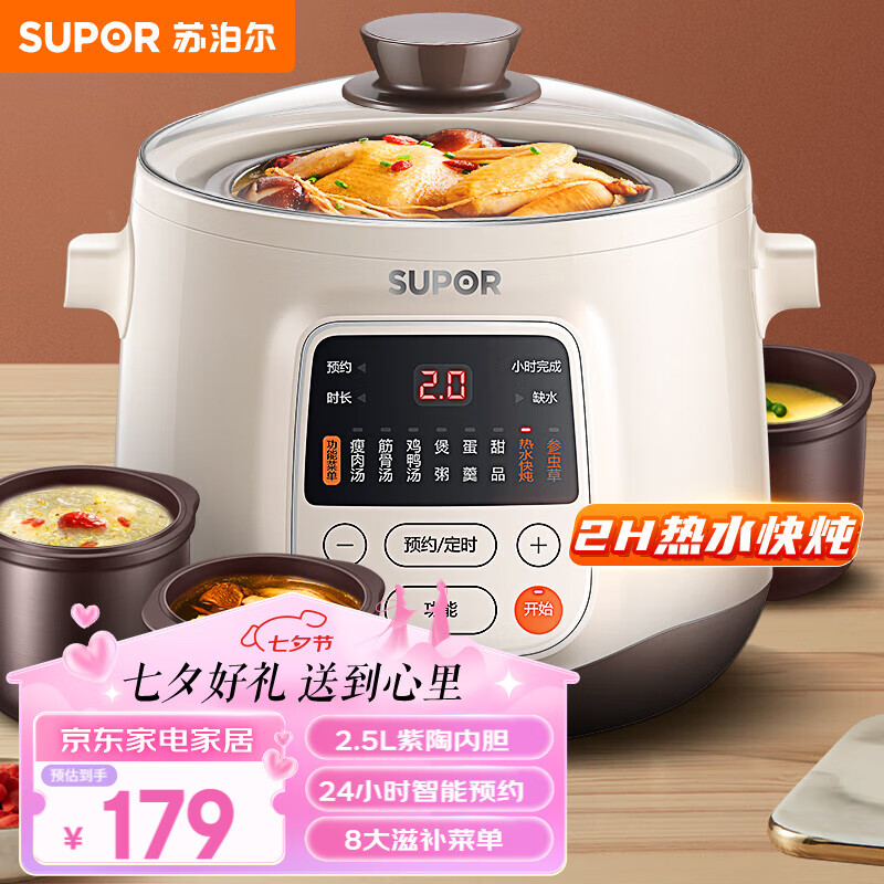 苏泊尔(SUPOR) 电炖锅 电炖盅 电砂锅 煲汤炖汤锅 紫砂锅 隔水炖 燕窝炖盅 煮粥神器 辅食电煮锅DZ25YC606 2.5L价格:179.00元!