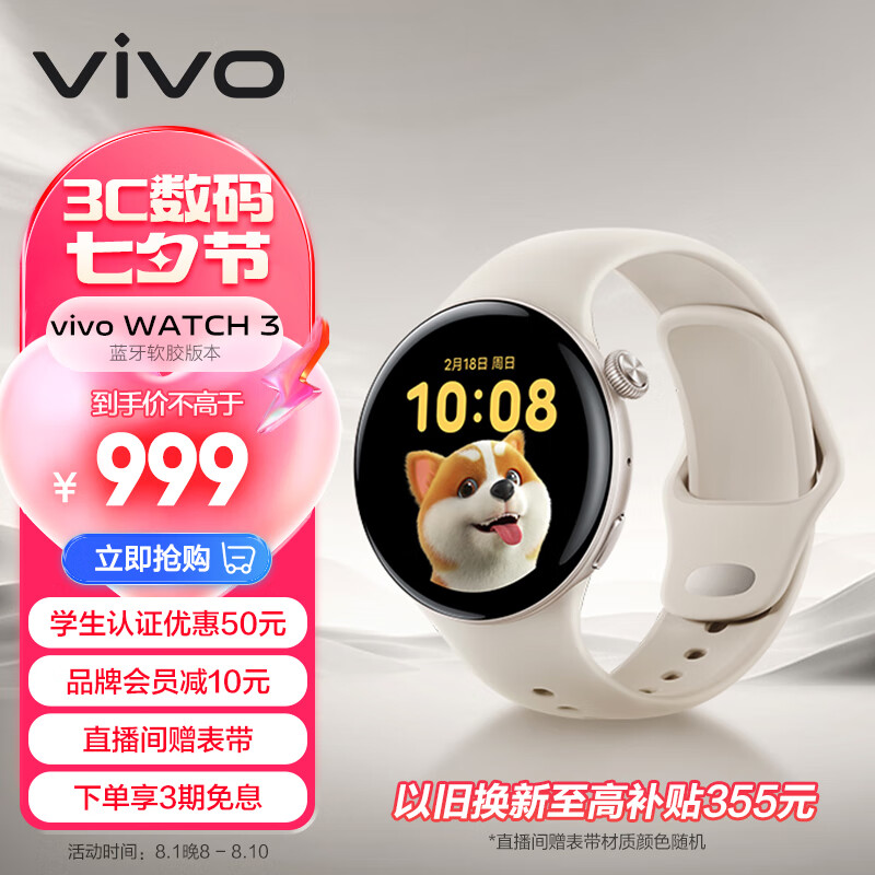 vivo WATCH 3 蓝牙软胶版月光白AIGC智能手表表盘男血氧心率监测自研蓝河系统超长续航vivowatch送女友价格:999.00元!