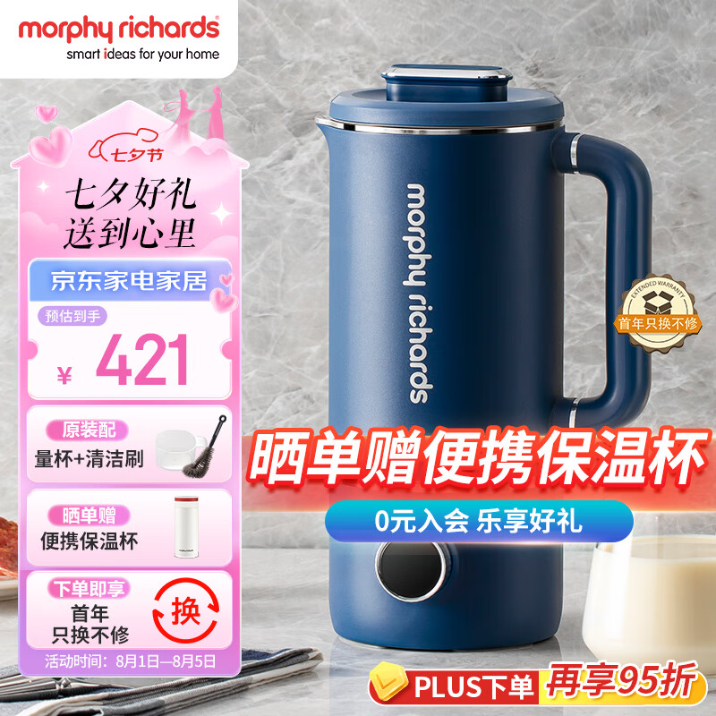 摩飞电器(Morphyrichards)豆浆机 家用破壁机 全自动清洗免过滤 低音降噪 多功能菜单可预约 600ml MR8200 蓝色价格:421.00元!