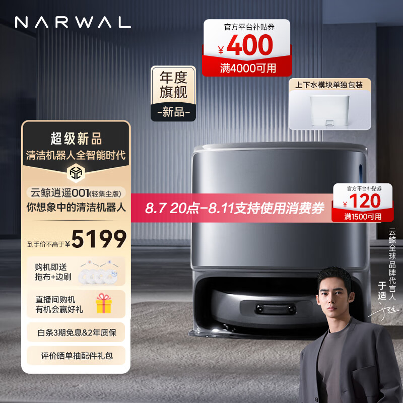 云鲸扫地机器人逍遥001轻集尘版 扫拖一体自动清洗全自动 双芯双目智能防缠绕拖地机 上下水套装深空灰价格:5599.00元!