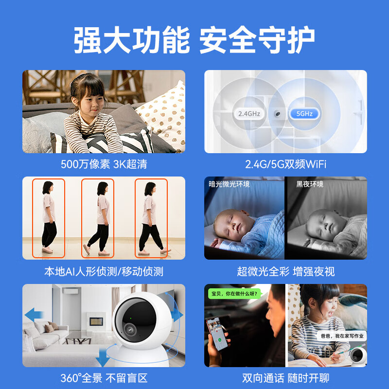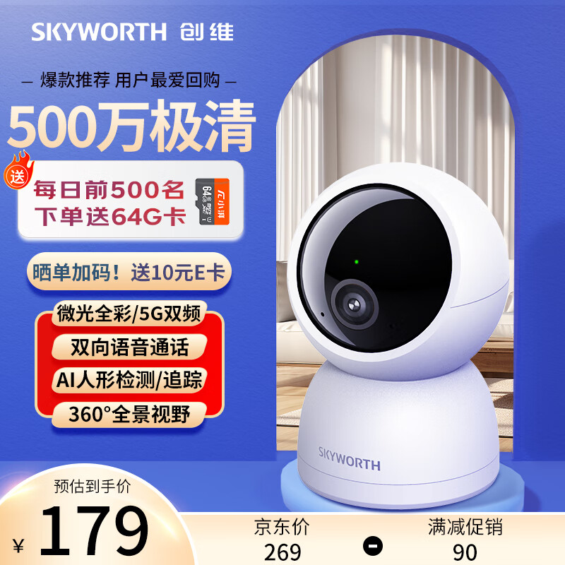 创维500万家用监控摄像头C50 送64G内存卡 5G双频WiFi 3K无线网络智能云台摄像机 超微光全彩人形追踪价格:269.00元!