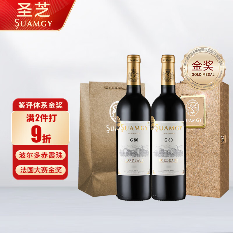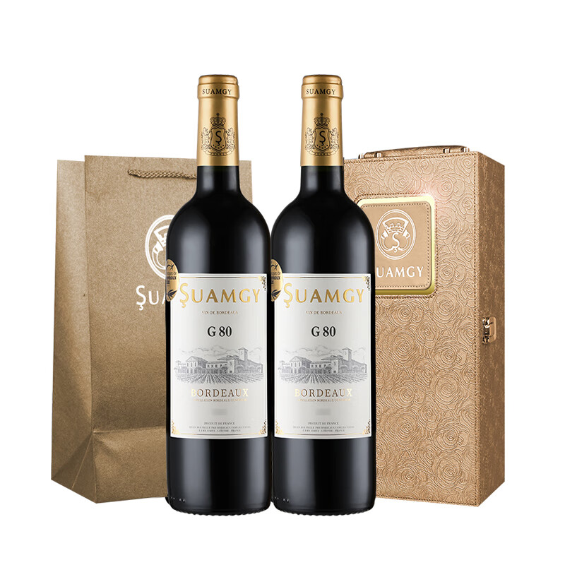 圣芝(Suamgy)G80波尔多AOC赤霞珠干红葡萄酒 750ml*2瓶 双支礼盒装 法国红酒价格:196.00元!