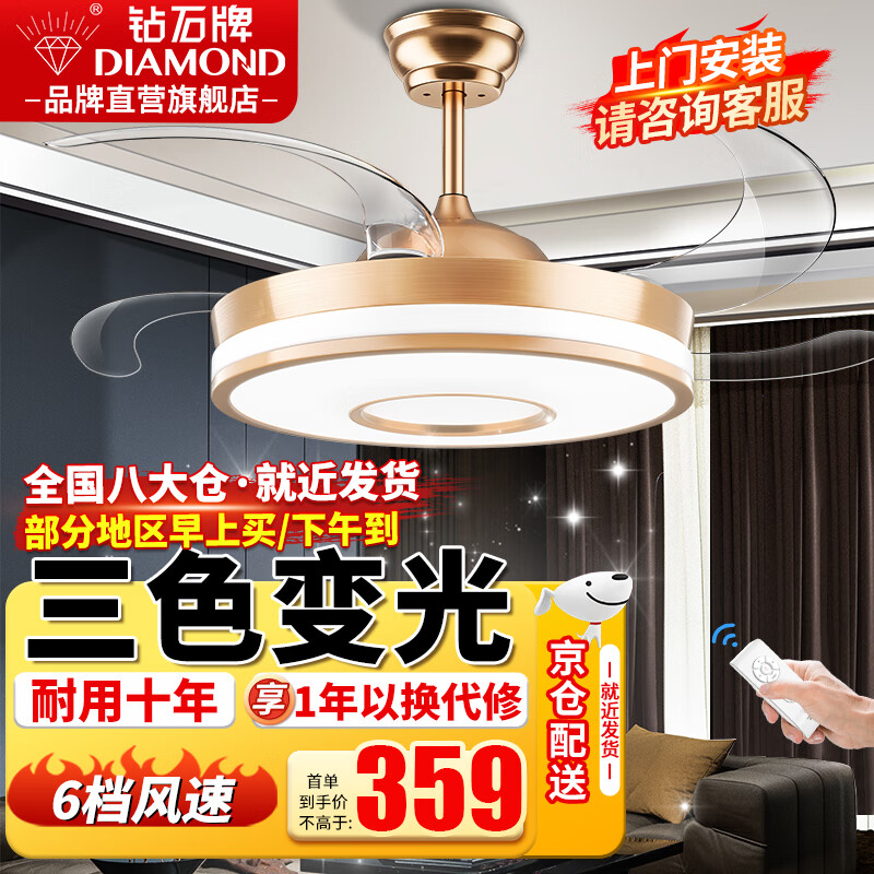 钻石牌(DIAMOND) 吊扇灯 隐形风扇灯led餐厅客厅卧室吊灯饰 现代简约电扇灯吸顶带灯吊扇 42吋金色圆中圆-6档遥控-正反转功能价格:419.00元!