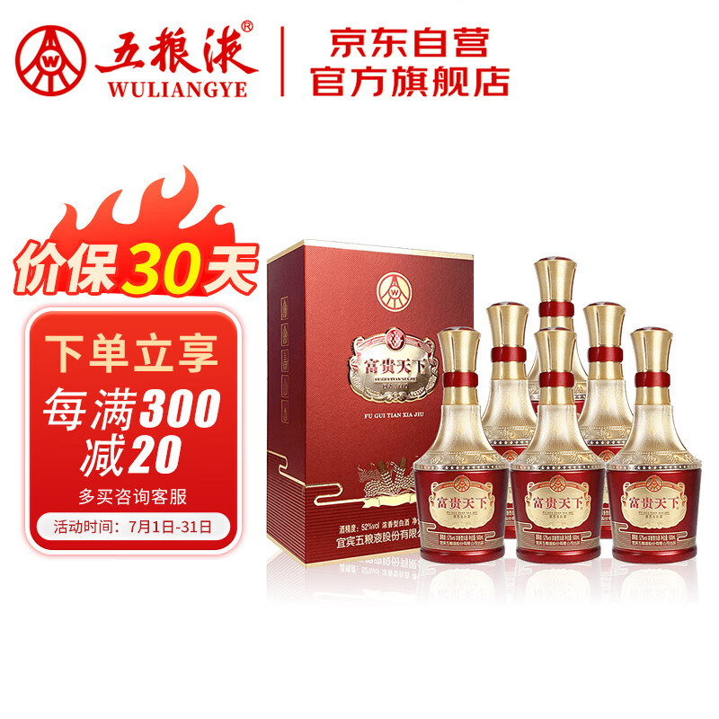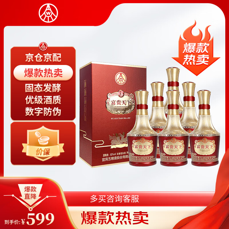 五粮液股份出品 富贵天下 金钻 浓香型白酒 52度500ml*6瓶 整箱中秋送礼价格:599.00元!