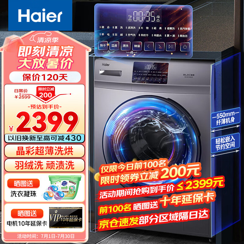 海尔全自动洗衣机洗烘一体机变频滚筒洗衣机家用10KG公斤大容量一级能效晶彩屏羽绒洗价格:2899.00元!