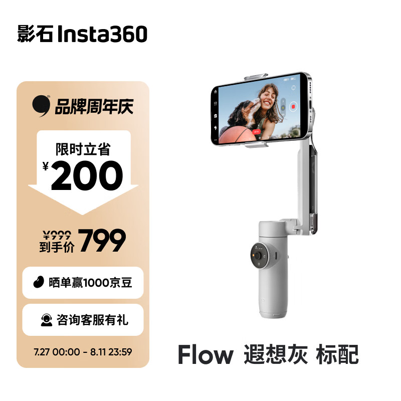 影石(Insta360)Flow手机云台稳定器 可折叠可伸缩自拍杆智能跟随三轴增稳防抖vlog直播神器手持稳定器灰色价格:799.00元!