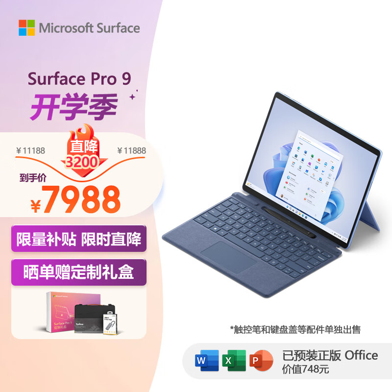 微软Surface Pro 9 二合一平板电脑i5/16G/256G 宝石蓝 13英寸触控 教育学习机高端办公轻薄笔记本电脑价格:7988.00元!