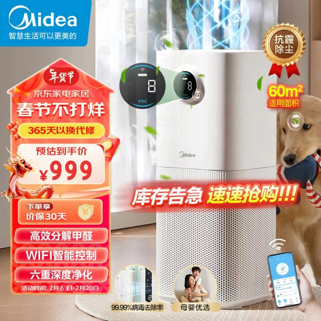 美的(Midea)【六重净化】空气净化器高效分解甲醛除烟味异味99.99%病菌去除率卧室专用空气消毒机KJ500G-L1价格:859.00元!
