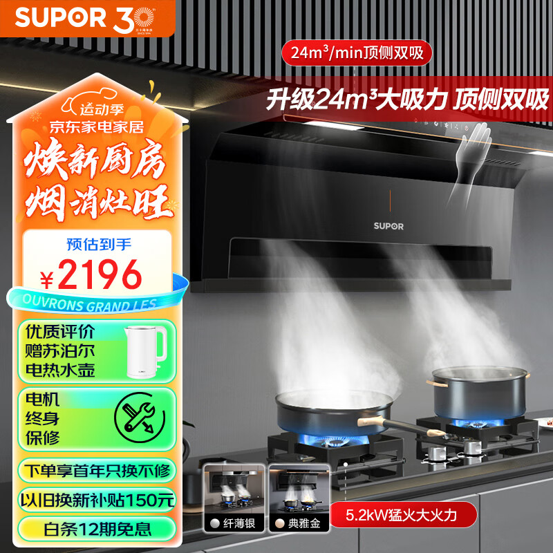 苏泊尔(SUPOR)抽油烟机 顶侧双吸7字型烟灶套装24立方挥手免拆洗家用烟机燃气灶具套装DE15+DB2Z7S天然气价格:2196.00元!