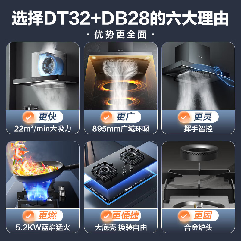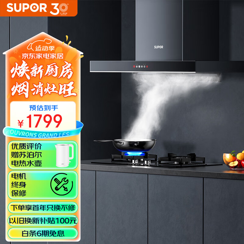 苏泊尔(SUPOR) 抽油烟机 烟灶套装22立方家用欧式吸油烟机燃气灶具套装挥手智控 自清洁 DT32+DB28液价格:1799.00元!