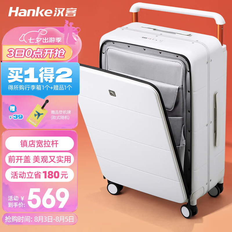 汉客宽拉杆行李箱铝框男前开盖拉杆箱女旅行箱大容量24英寸烟白密码箱价格:749.00元!