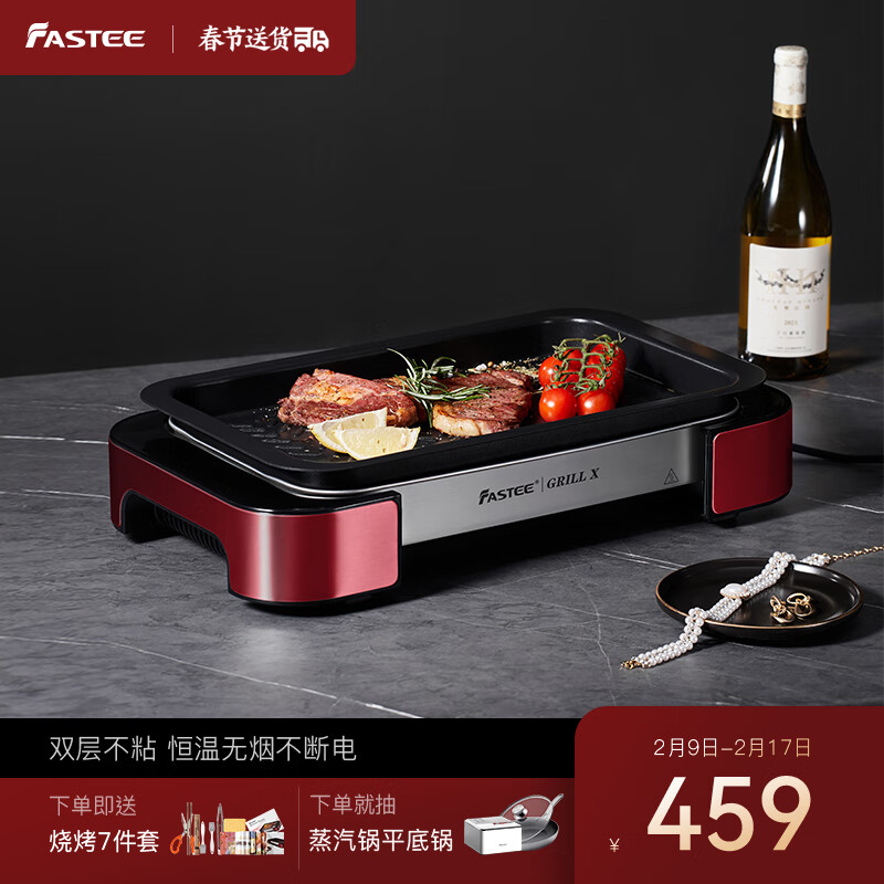 法诗缇(Fastee)烤肉锅家用无烟电烤盘电烧烤炉不粘多功能铁板烧煎蛋烙饼牛排海鲜电煎盘 FST-53A 拉菲红-轻油无烟煎烤盘价格:519.00元!