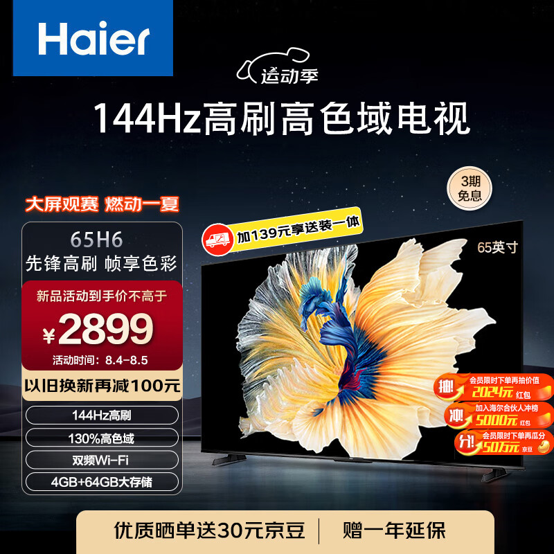 海尔(Haier)65H6 65英寸电视 4K超高清 144Hz屏 4+64GB 超薄游戏电视智能液晶平板电视机以旧换新价格:2899.00元!